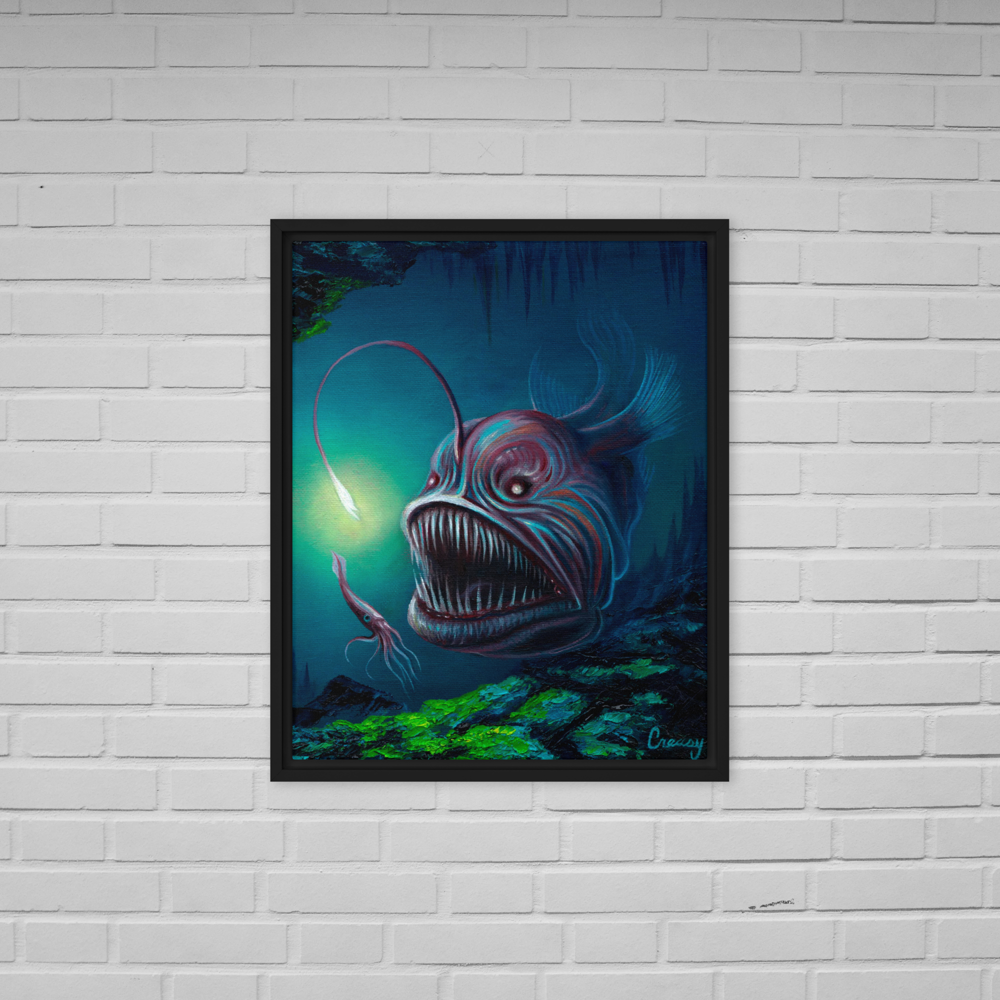 Spice up your blank walls with this Angler Fish framed canvas! This high-quality pine tree framed canvas comes with rubber pads on the back corners and wall mount that makes hanging the artwork hassle-free. What’s more, the frame gives the canvas a cool floating effect!